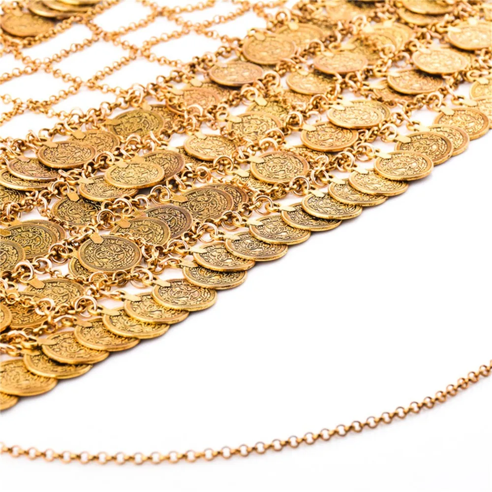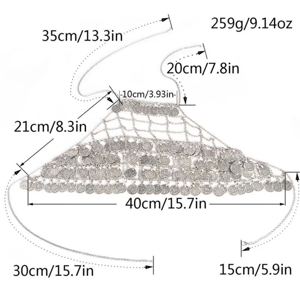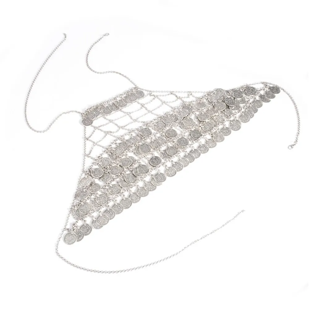 Bohemian Metal Mesh Gypsy Body Sexy Belly Chain Coin Tassel Bikini Bra Net Floral Slave Harness Underwear Bra Chain Body Jewelry