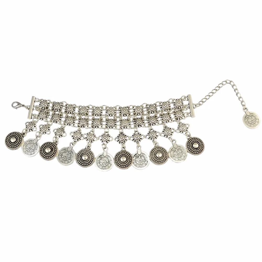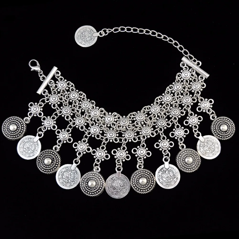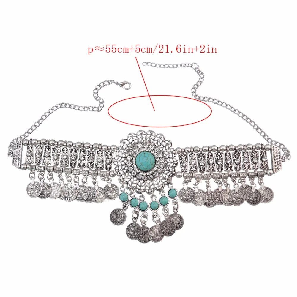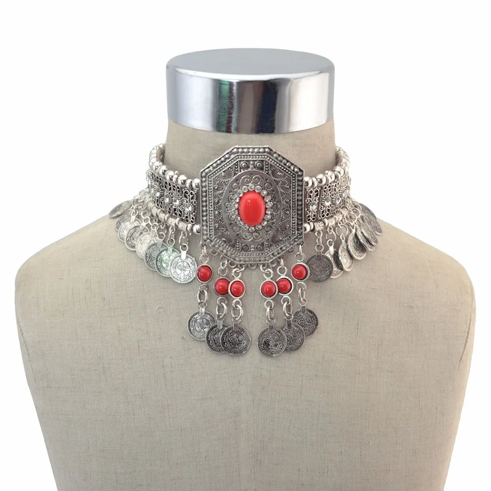 Gypsy Turkish Boho Antique Red Green Stone Choker Necklace with Coin Tassel Ethnic Coin Statement Necklace Vintage Jewelry Gift
